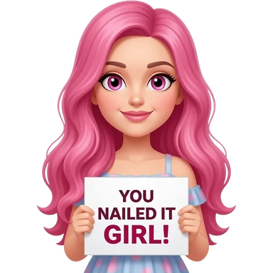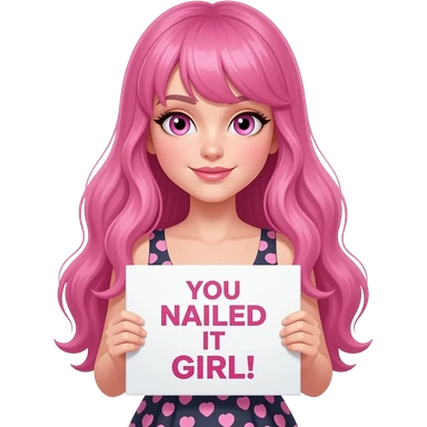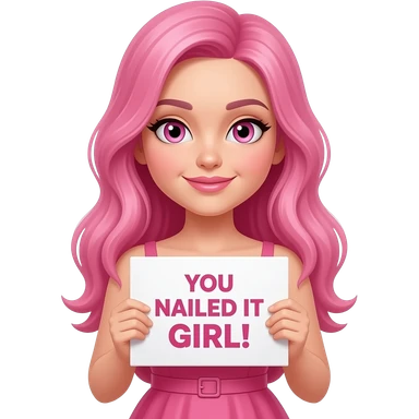 sexy girl with long pink hair and pink eyes wearing a dress holding a YOU NAILED IT GIRL! sign emoji