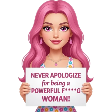 sexy girl with long pink hair and pink eyes wearing a dress holding a NEVER APOLOGIZE for being a POWERFUL F***ING WOMAN! sign emoji