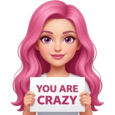 sexy girl with long pink hair and pink eyes wearing a holding a YOU ARE CRAZY sign emoji