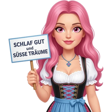 sexy girl with long pink hair and pink eyes wearing a dirndl holding a SCHLAF GUT und SÜSSE TRÄUME sign emoji