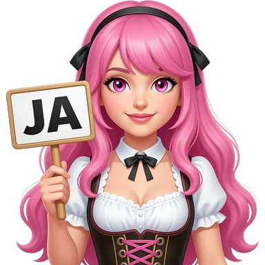 sexy girl with long pink hair and pink eyes wearing a dirndl holding a JA sign emoji