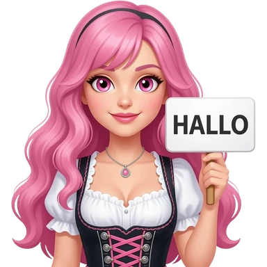 sexy girl with long pink hair and pink eyes wearing a dirndl holding a HALLO sign emoji