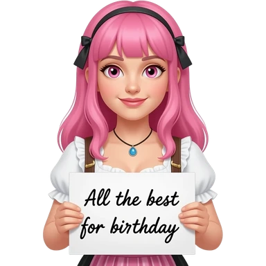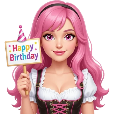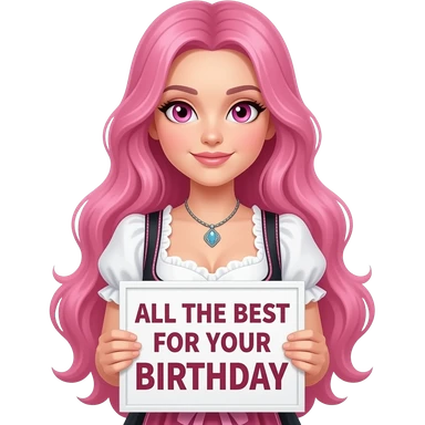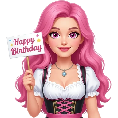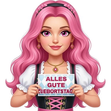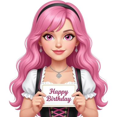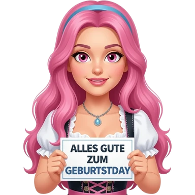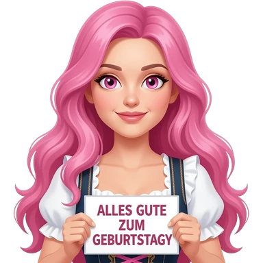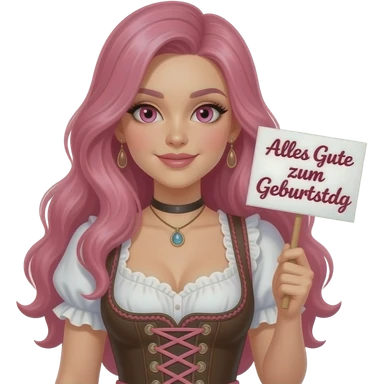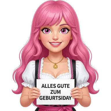 sexy girl with long pink hair and pink eyes wearing a dirndl holding a ALLES GUTE ZUM GEBURTSTAG sign emoji