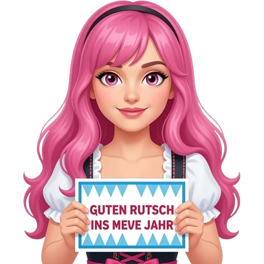 sexy girl with long pink hair and pink eyes wearing a dirndl holding a GUTEN RUTSCH INS NEUE JAHR sign emoji