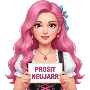 sexy girl with long pink hair and pink eyes wearing a dirndl holding a PROSIT NEUJAHR sign emoji