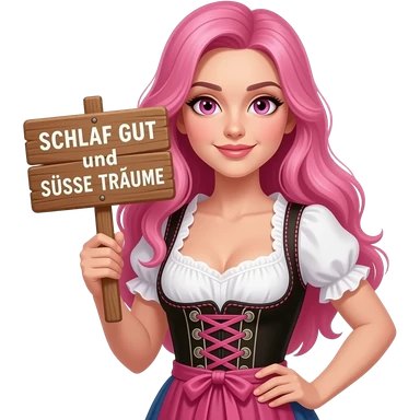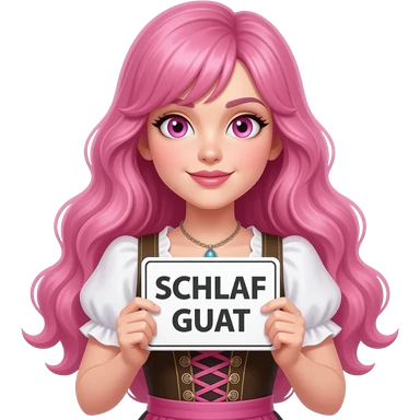 sexy girl with long pink hair and pink eyes wearing a dirndl holding a SCHLAF GUAT sign emoji