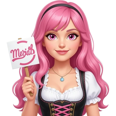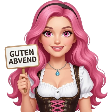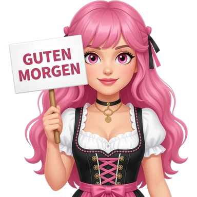 sexy girl with long pink hair and pink eyes wearing a dirndl holding a GUTEN MORGEN sign emoji