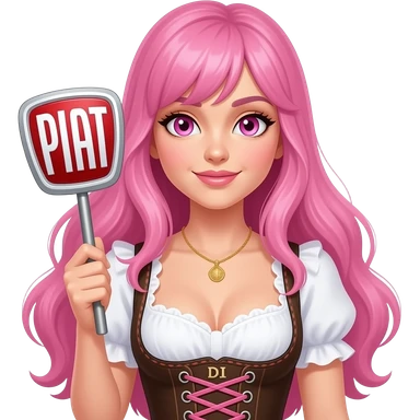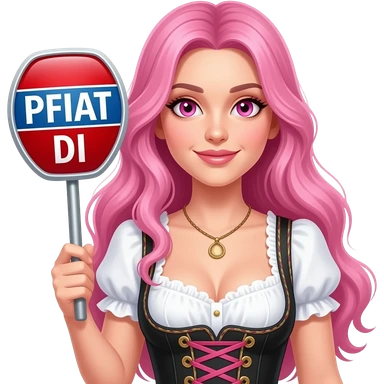 sexy girl with long pink hair and pink eyes wearing a dirndl holding a PFIAT DI sign emoji
