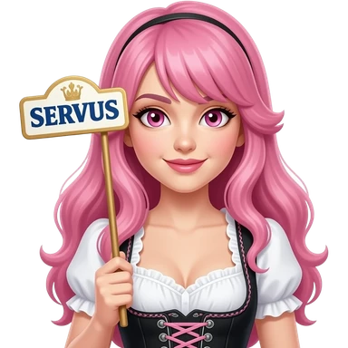 sexy girl with long pink hair and pink eyes wearing a dirndl holding a SERVUS sign emoji