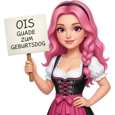 sexy girl with long pink hair and pink eyes wearing a dirndl holding a OIS GUADE ZUM GEBURTSDOG sign emoji