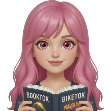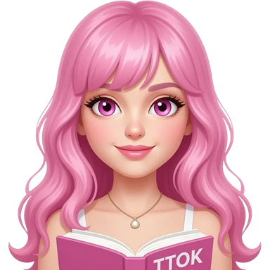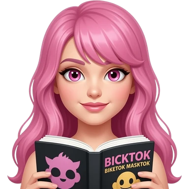 sexy girl with long pink hair and pink eyes holding a BOOKTOK BIKETOK MASKTOK emoji