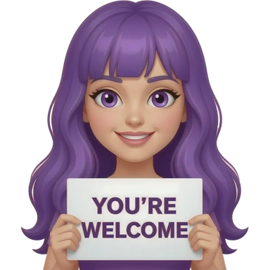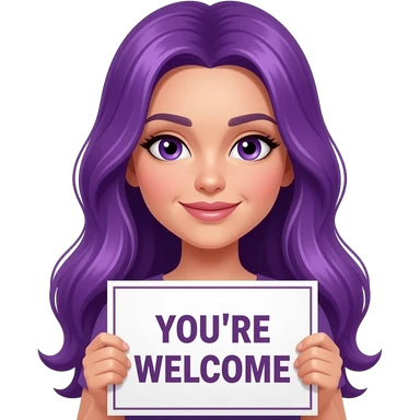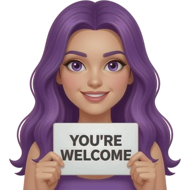 sexy girl with long purple hair and purple eyes holding a YOU'RE WELCOME sign emoji