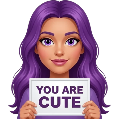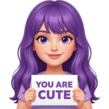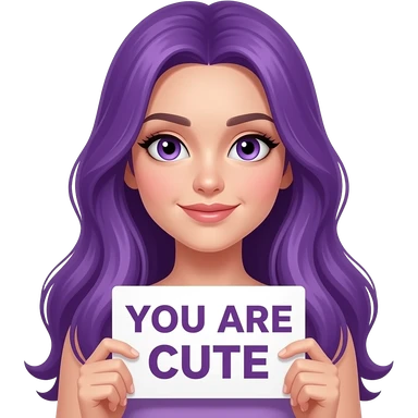 sexy girl with long purple hair and purple eyes holding a YOU ARE CUTE sign emoji