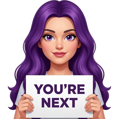 sexy girl with long purple hair and purple eyes holding a YOU'RE NEXT sign emoji