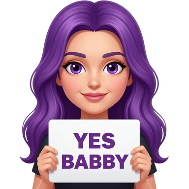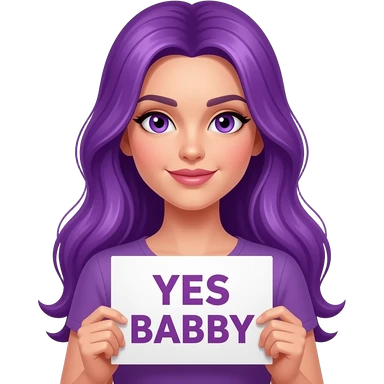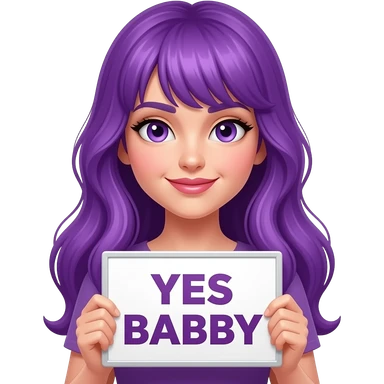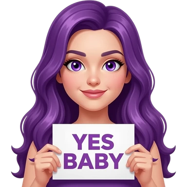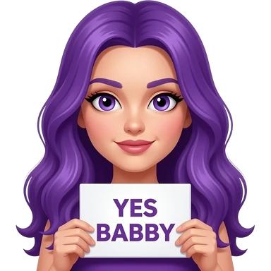 sexy girl with long purple hair and purple eyes holding a YES BABY sign emoji