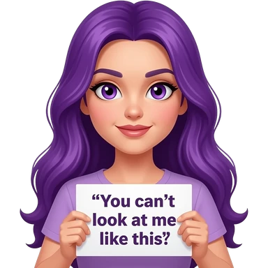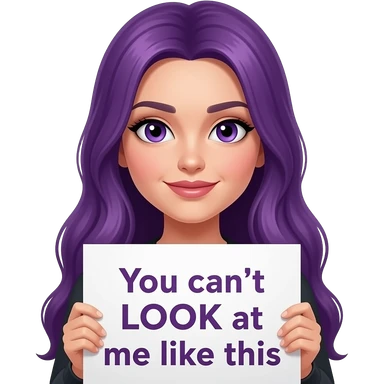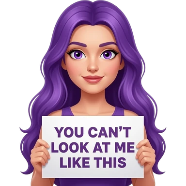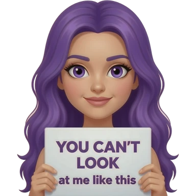 sexy girl with long purple hair and purple eyes holding a YOU CAN'T LOOK at me like this sign emoji