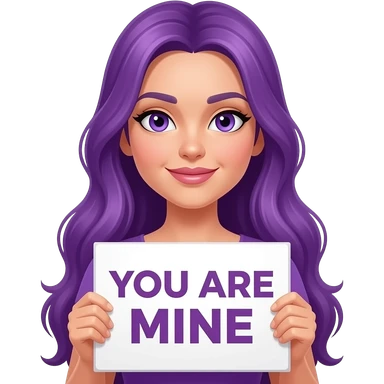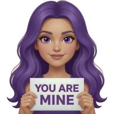 sexy girl with long purple hair and purple eyes holding a YOU ARE MINE sign emoji