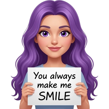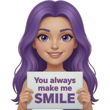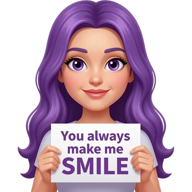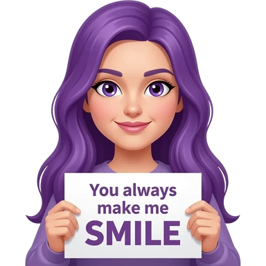 sexy girl with long purple hair and purple eyes holding a You always make me SMILE sign emoji