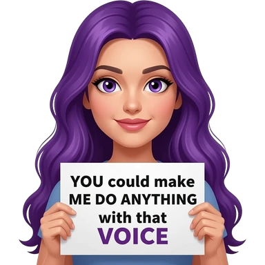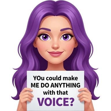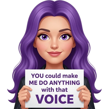 sexy girl with long purple hair and purple eyes holding a YOU could make ME DO ANYTHING with that VOICE sign emoji