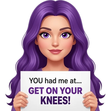 sexy girl with long purple hair and purple eyes holding a YOU had me at... GET ON YOUR KNEES! sign emoji