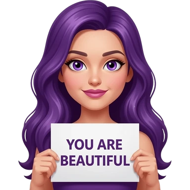 sexy girl with long purple hair and purple eyes holding a YOU ARE BEAUTIFUL sign emoji