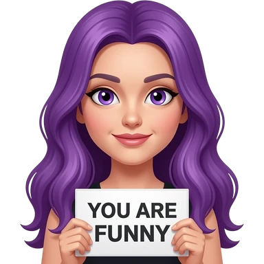 sexy girl with long purple hair and purple eyes holding a YOU ARE FUNNY sign emoji