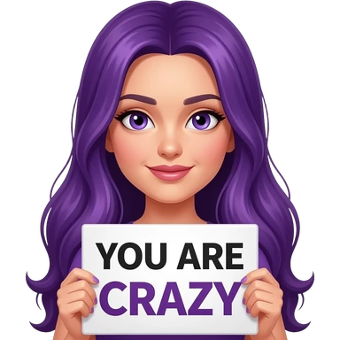 sexy girl with long purple hair and purple eyes holding a YOU ARE CRAZY sign emoji