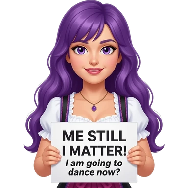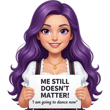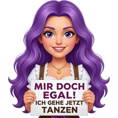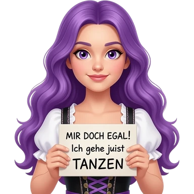 sexy girl with long purple hair and purple eyes wearing a dirndl holding a MIR DOCH EGAL! ICH GEHE JETZT TANZEN sign emoji