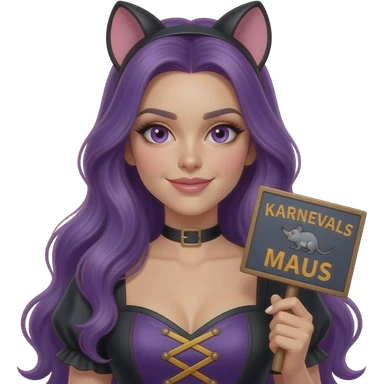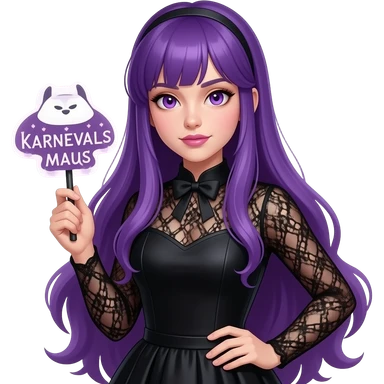 sexy girl with long purple hair and purple eyes wearing a halloween dress holding a KARNEVALS MAUS sign emoji