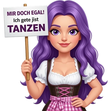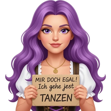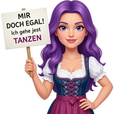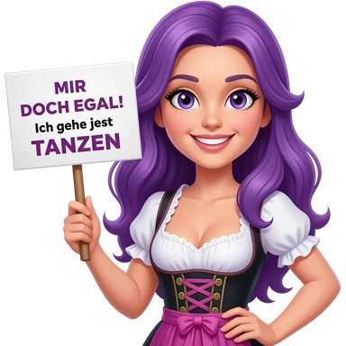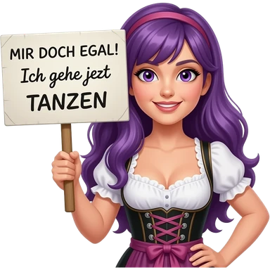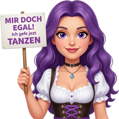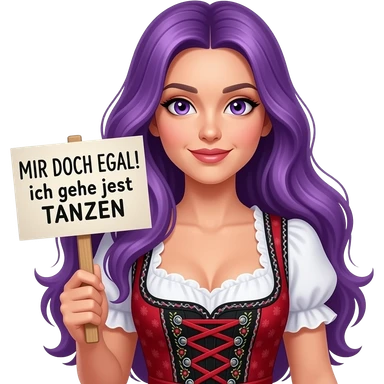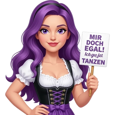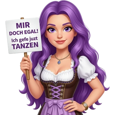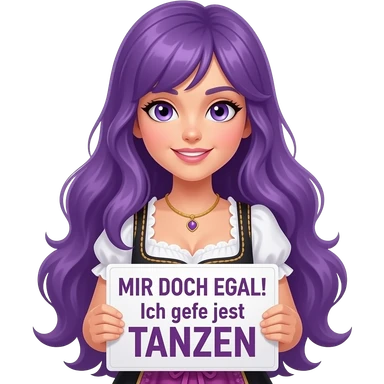 sexy girl with long purple hair and purple eyes wearing a dirndl holding a MIR DOCH EGAL! Ich gehe jetzt TANZEN sign emoji