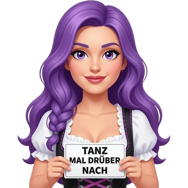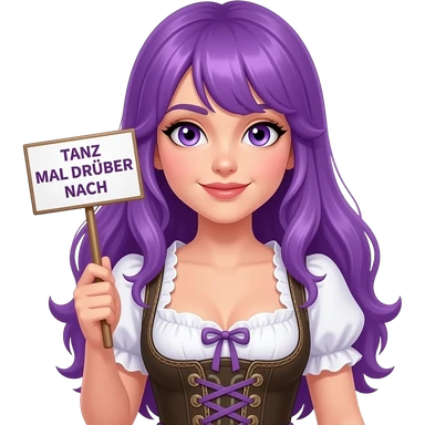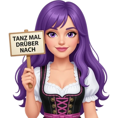 sexy girl with long purple hair and purple eyes wearing a dirndl holding a TANZ MAL DRÜBER NACH sign emoji