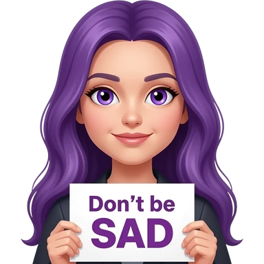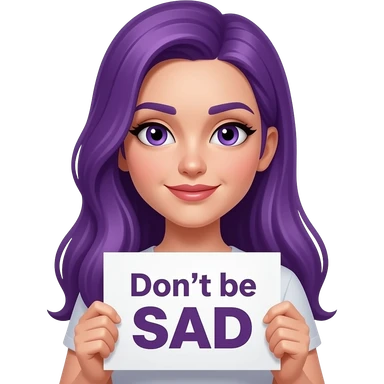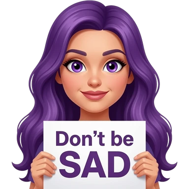 sexy girl with long purple hair and purple eyes holding Don't be SAD sign emoji