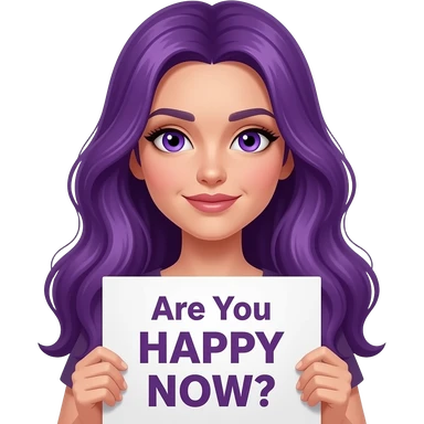 sexy girl with long purple hair and purple eyes holding Are You HAPPY NOW? sign emoji