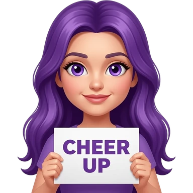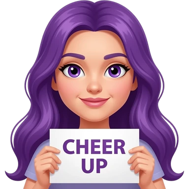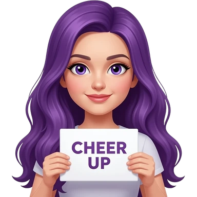 sexy girl with long purple hair and purple eyes holding CHEER UP sign emoji