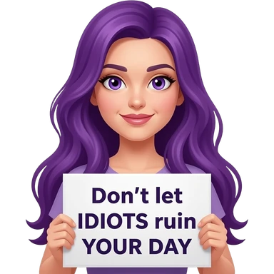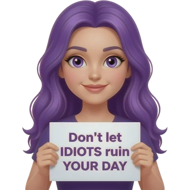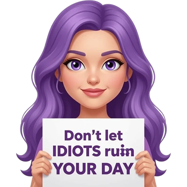 sexy girl with long purple hair and purple eyes holding Don't let IDIOTS ruin YOUR DAY sign emoji