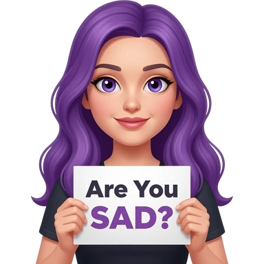 sexy girl with long purple hair and purple eyes holding Are You SAD? sign emoji