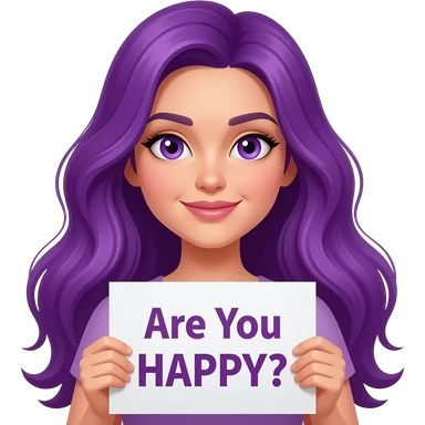 sexy girl with long purple hair and purple eyes holding Are You HAPPY? sign emoji