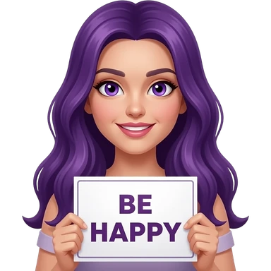 sexy girl with long purple hair and purple eyes holding BE HAPPY sign emoji