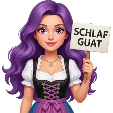 sexy girl with long purple hair and purple eyes wearing a dirndl holding a SCHLAF GUAT sign emoji