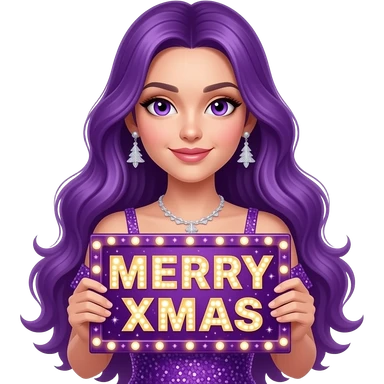 sexy girl with long purple hair and purple eyes wearing a christmas dressholding a MERRY XMAS sign emoji