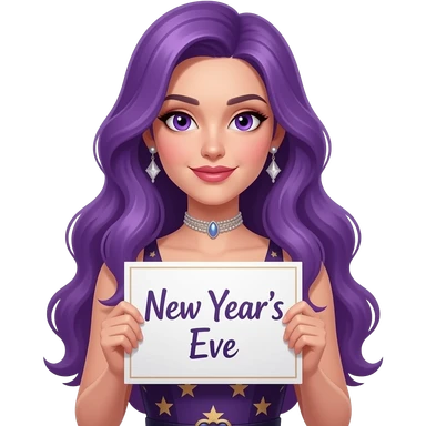 sexy girl with long purple hair and purple eyes wearing a new years dress holding a NEW YEARS EVE sign emoji