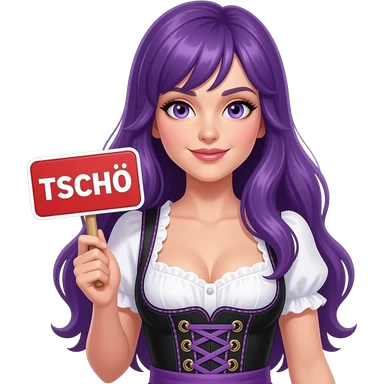 sexy girl with long purple hair and purple eyes wearing a dirndl holding a TSCHÖ sign emoji