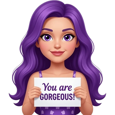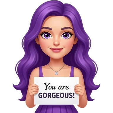 sexy girl with long purple hair and purple eyes wearing a dress holding a You are GORGEOUS! sign emoji