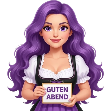 sexy girl with long purple hair and purple eyes wearing a dirndl holding a GUTEN ABEND sign emoji