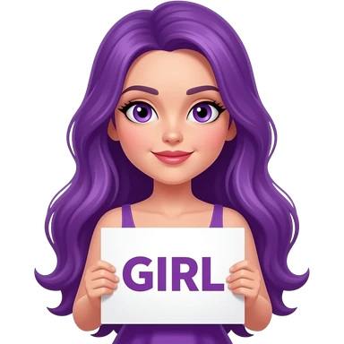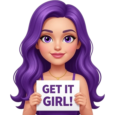 sexy girl with long purple hair and purple eyes wearing a dress holding a GET IT GIRL! sign emoji