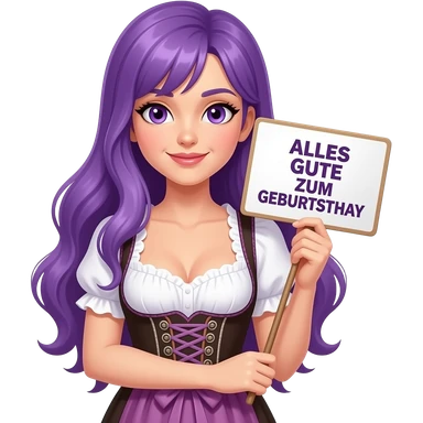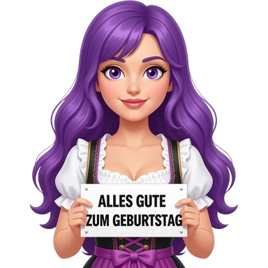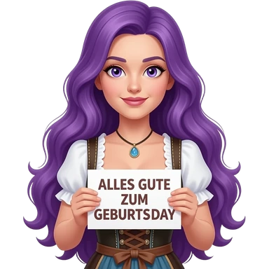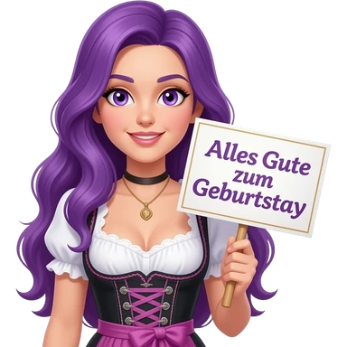 sexy girl with long purple hair and purple eyes wearing a dirndl holding a ALLES GUTE ZUM GEBURTSTAG sign emoji