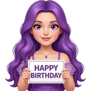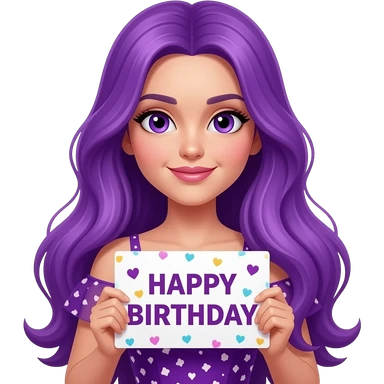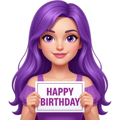 sexy girl with long purple hair and purple eyes wearing a birthday dress holding a HAPPY BIRTHDAY sign emoji