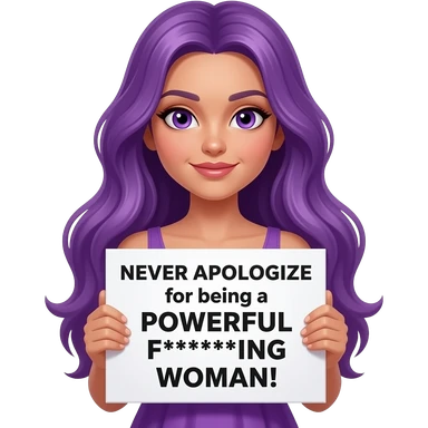 sexy girl with long purple hair and purple eyes wearing a dress holding a NEVER APOLOGIZE for being a POWERFUL F***ING WOMAN! sign emoji