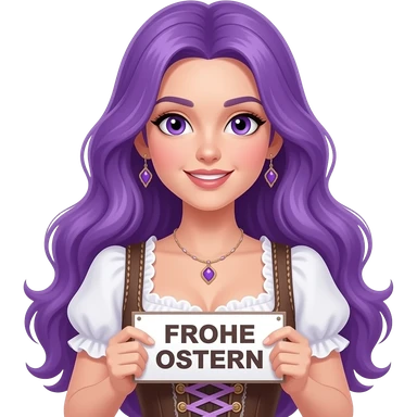 sexy girl with long purple hair and purple eyes wearing a dirndl holding a FROHE OSTERN sign emoji