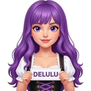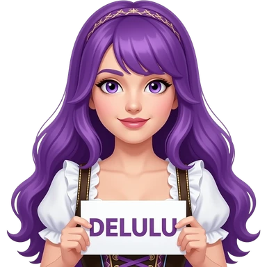 sexy girl with long purple hair and purple eyes wearing a dirndl holding a DELULU sign emoji